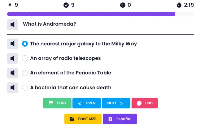 Special Feature: The speaker icon allows you to listen to the question and available answers aloud as needed.